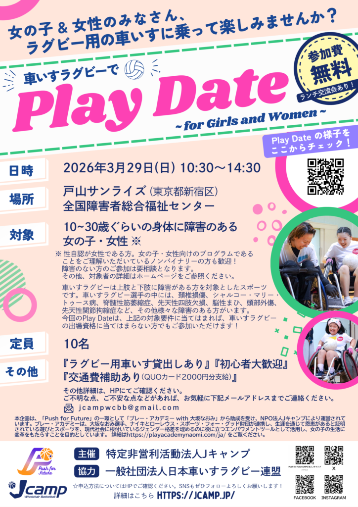 NPO法人Jキャンプでは、2026年もスポーツを通して障害のある女の子や若い世代の女性の“一歩踏み出す”を後押しするプロジェクト『Push for Future』を実施します!今回は、3月に開催のプログラム「Play Date」への参加者を募集します!